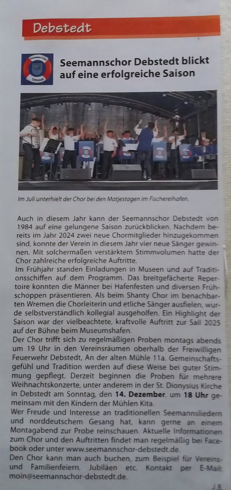 Seit 1984 existiert unser Chor in Debstedt. Zur Zeit sind wir 17 Männer und eine Akkordeonspielerin, die einmal pro Woche zum gemeinsamen Singen zusammenkommen. Wir werden musikalisch angeführt von unserem Chorleiter Dieter und instrumentell begleitet von unseren Akkordeonspielern Birgit und Horst. Regelmäßig treten wir auf bei Vereinen, Hafenfesten, im Schaufenster Fischereihafen etc.